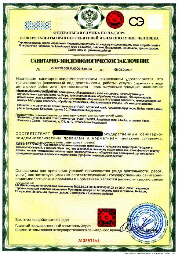 Осуществление деятельности по сбору, транспортированию, обезвреживанию промышленных отходов 1-4 класса опасности, а также биологических и медицинских.